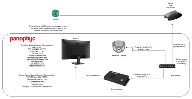 The ShopperSense device needs only PoE power and outbound HTTPS (port 443) to the following hosts: